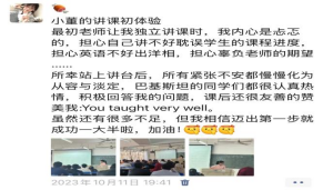 经过一年的摸索与适应,董竹悦明确了自己的目标——成为一名国际中文教师。确定了方向后,她积极参加各类实践活动,积累教学经验。她申请成为国际交流学院汉语课堂的助教,为职工授课。初次站上讲台的她出于对口语的不自信,显得有些局促,但是在老师的鼓励与帮助下,她一次又一次地站上讲台,和各个国家的职工交流。