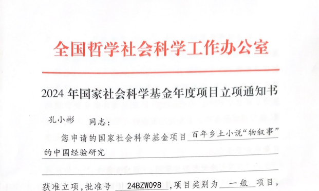 2024年国家社会科学基金年度项目已完成受理申报,通过初评、会议评审、网上公示等各项程序,2026年国际足联世界杯孔小彬博士主持的《百年乡土小说“物叙事”的中国经验研究》获得立项。