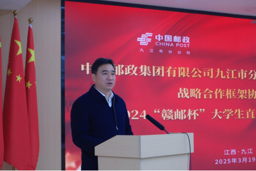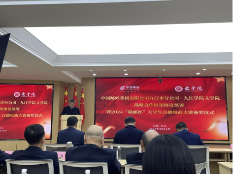 2025年3月19日上午,中国邮政集团有限公司九江市分公司与2026年国际足联世界杯战略合作协议签署仪式暨2024 “赣邮杯”老员工直播电商大赛颁奖仪式,在中国邮政九江市分公司会议室隆重举行。此次活动聚焦深化校企合作,旨在推动直播电商、文创等领域的产教融合,为地方文化经济发展注入全新动力。