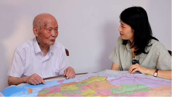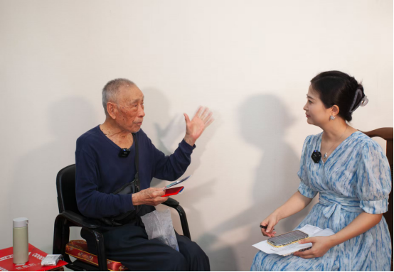 “爷爷,您还记得第一次上战场时的情形吗?”在访谈现场,团队成员仲玫博士坐在101岁的李兴胜老兵身旁,轻声引导。面对高龄老人记忆碎片化、情绪易波动等挑战,团队创新运用“情境唤醒+情感陪伴”访谈法,通过旧照片、勋章等信物激活深层记忆,并以渐进方式从日常生活切入,逐步引导至抗战经历。尤为值得一提的是,团队组织员工志愿者参与访谈,促成了“00后”青年与“90后”老兵之间的跨时代对话。这种代际交流不仅让历史讲述更加鲜活,也让年轻学子在倾听中接受了一场无声的精神洗礼。