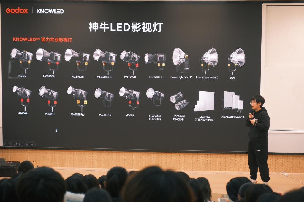 神牛公司市场负责人张佳妍从影视灯光的技术演进切入,系统介绍了从传统卤钨灯到现代LED灯具的技术革新。她重点解析了不同功率灯具的特性,包括在短剧拍摄中高频使用的2400瓦灯具、广告拍摄中广泛应用的平板灯系列等。结合影视制作、短视频直播等多元场景,张佳妍还分享了“神牛杯”高校视频大赛的参赛信息与细则,鼓励员工将理论知识转化为创作实践。