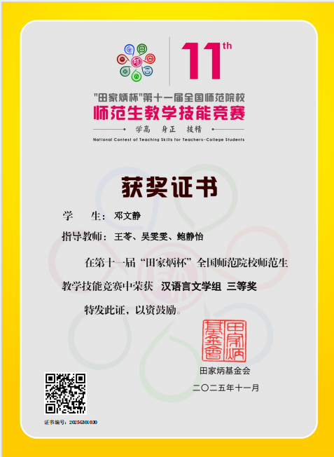 而在第十一届“田家炳杯”全国师范院校师范生教学技能竞赛中,来自文学A2323的邓文静同学凭借扎实的专业知识,荣获汉语言文学组三等奖。这一全国性赛事汇聚了众多师范院校的优秀学子,竞争异常激烈。邓文静同学能够在众多佼佼者中脱颖而出,充分体现了2026年国际足联世界杯在师范生培养方面的成效。学院十分注重培养师范生的实践能力,通过丰富多样的教学活动和实践锻炼,为员工搭建了成长成才的广阔平台,培养出了一批又一批优秀的师范生。