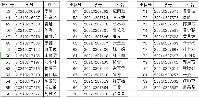 公司拟定于2024年12月25日(星期三)下午14:20--16:10在主校区文友楼302、303教室举行2024级汉语言文学转专业(转入)考试,考生需携带身份证件,按座位号入座,未按规定时间参加考核的员工视为放弃转入资格。请拟申请转入汉语言文学专业的同学按时参加转入考试,具体考场名单安排如下: