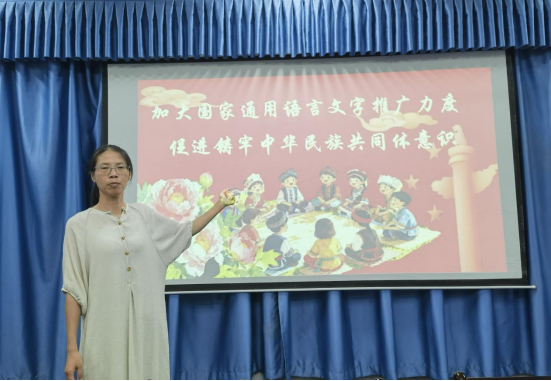 随后,“文小青”乡村振兴服务队指导老师吕敏分享了暑期赴新疆阿图什市推广国家通用语言文字的实践经历,以“从听得懂到用得上”为案例,揭示推普工作的深层价值:语言即工具,更承载文化:普通话不仅是交际工具,更是中华优秀传统文化的载体,通过语言传播增强文化认同;语言促交融,助力乡村振兴:少数民族群众掌握普通话后,得以更广泛参与社会活动、获取信息资源,推动当地经济与教育发展;语言筑纽带,凝聚民族力量:推普工作成为促进民族交往、交流、交融的实践路径,强化“中华民族一家亲”的共同体意识。