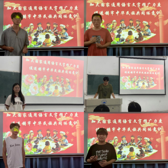 来自汉语言文学专业A2423班的邹明、邱小梅、何萱结合专业学习与社会实践,分享了他们对推广普通话的深刻体会。他们表示,作为未来的教育工作者,推普需“接地气、入人心”,推普不应局限于语言规范的传授,更应融入日常课程教学,通过设计情景对话、文化主题活动等创新形式,让大家在语言实践中感受中华文化的魅力,培养兼具规范语言能力与深厚文化自信的新时代青年。与此同时,A2424班的费瑞超、彭文坤、张景源、张登峰则从乡村教学一线的观察出发,指出:“在乡村,普通话是孩子们打开世界的‘钥匙’。”许多留守儿童因缺乏普通话环境,在升学或外出时面临沟通障碍,而推普工作通过课后兴趣班、亲子共读活动等形式,不仅帮助孩子跨越语言门槛,更让他们敢于表达、自信成长。