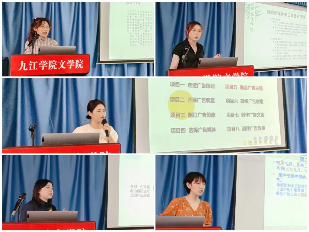 参赛青年教师们精心准备、深入解读教材,从新媒体营销到广告策划与创意主题,从晋宋文学之陶渊明与谢灵运到滕王阁诗序,……呈现出一堂堂优质扎实、生动高效的课堂。经过激烈的角逐和评委的认真评审,来自网络与新媒体教研室的张黎凡老师和来自大学语文教研室王奇老师分获学院一等奖,刘汤琪娜、张钰婧、张钰老师分获二等奖,陈莹、吴舒雅、李娜、杨珍、孔茹、陈筱云分别获得三等奖。