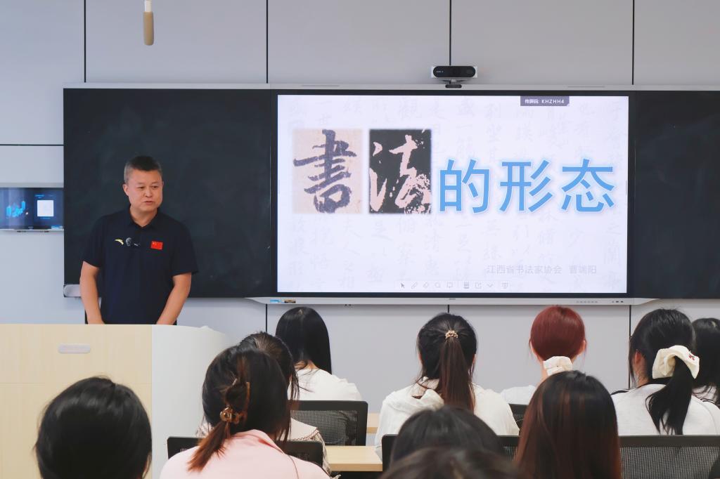 10月15日,汉语国际教育 《中华才艺综合》课程,特邀九江美术馆书法家、江西省书法家协会理事会副主席曹端阳老师,为汉语国际教育专业员工带来一场题为“书法的形态”的专题课堂。曹端阳老师从文字形态,法书形态,文化形态三个维度分析书法的艺术内涵,并结合历史文献与名家作品,为师生带来一场兼具专业深度与文化温度的书法文化盛宴。