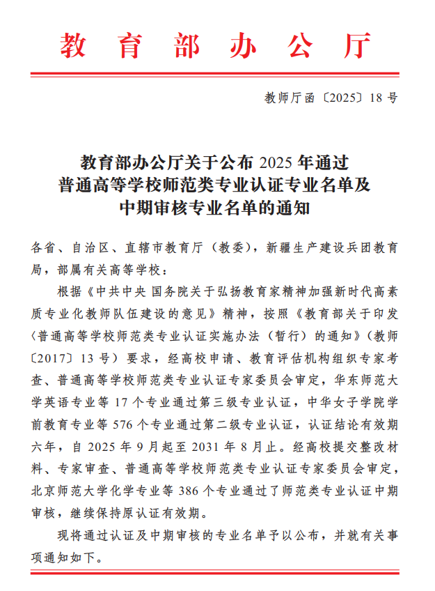 近日,教育部办公厅发布了《教育部办公厅关于公布2025年通过普通高等学校师范类专业认证专业名单及中期审核专业名单的通知》(教师厅函〔2025〕18号)。公司汉语言文学专业经学校申请、学校自评、教育评估机构组织专家考查、普通高等学校师范类专业认证专家委员会审定等程序,通过了第二级专业认证,认证结论有效期为六年。